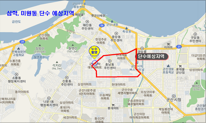 시에 따르면, 삼학동과 미원동 일원에 단수 및 출수 불량이 예상되며, 누수지 밸브 조작해 누수량 저감하고, 출근 시간 이후 단수 및 누수 보수공사를 시행할 계획이다.