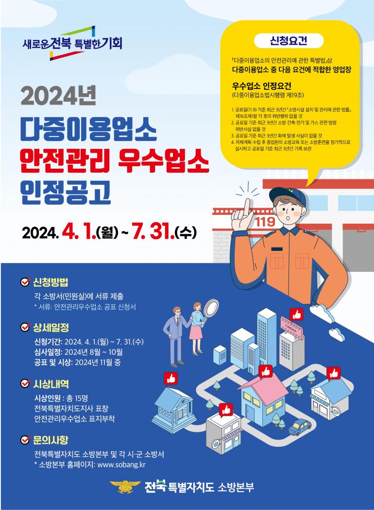 군산소방서(서장 구창덕)는 다중이용업소 영업주의 안전관리 이행 실태가 우수한 업소를 선정하기 위한 ‘2024년도 다중이용업소 안전관리 우수업소’를 오는 7월 31일까지 모집한다.
