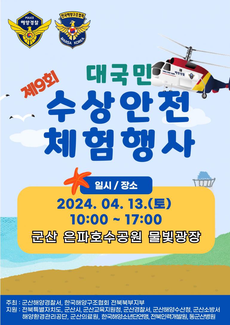 이번 행사는 군산해경과 한국해양구조협회 전북북부지부가 공동으로 주관하고 전북특별자치도, 군산시, 군산지방해수청, 군산소방서 등 17개 기관과 단체의 지원을 받는다.