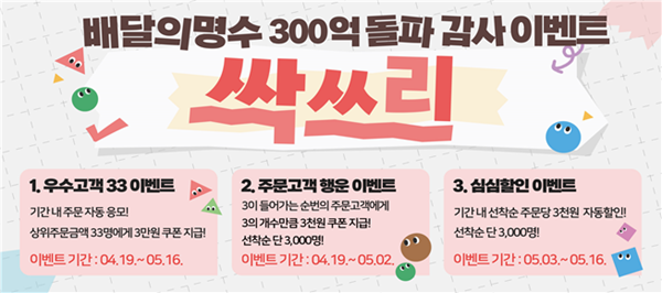 공공배달앱 ‘배달의 명수’가 매출액 300억원을 돌파하며 기념 이벤트를 진행한다.
