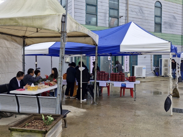 지난 20일 사랑의 밥상 나눔터에서 진행된 바자회에서는 예사봉사단과 자원봉사자들이 정성껏 준비한 통닭, 파전, 떡볶이, 순대 등 다양한 먹거리와 함께 화장지, 미역, 다시마, 구운 김 등이 판매됐다.