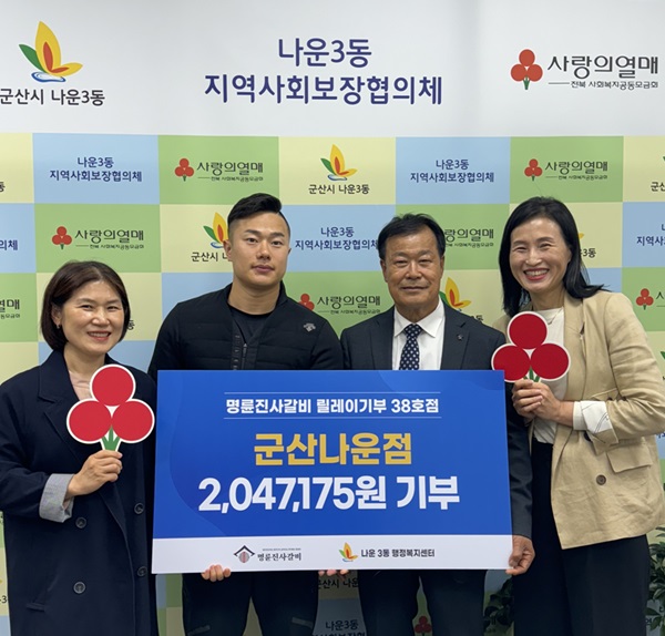 김소영 나운3동장은 “이웃을 위해 아낌없는 나눔을 해주신 명륜진사갈비 군산나운점과 동참해 주신 모든 분께 감사의 말씀을 드린다”며 “기탁받은 후원금은 도움이 필요한 지역주민들에게 소중히 잘 사용하겠다”고 말했다.