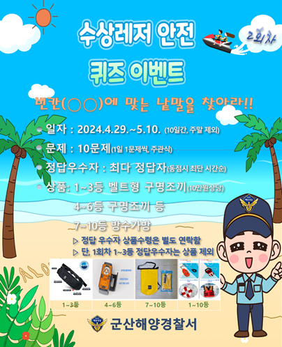 군산해양경찰서(서장 박경채)는 29일부터 내달 10일까지‘수상레저 안전 퀴즈 이벤트’를 진행한다.