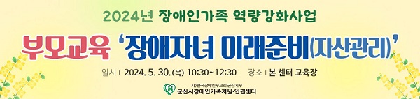부모교육 ‘장애자녀 미래준비 (자산관리)’ 교육은 오는 30일 목요일 장애인가족지원인권 센터에서 진행될 예정이며 모집인원은 군산시 장애인 가족 10명이다. 신청은 오는 17일까지다.