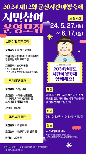 군산시는 제12회 군산시간여행축제 시민기획 ,프리마켓 ,주전부리 등 시민참여프로그램 운영자를 이달 27일부터 오는 6월17일까지 21일간 모집한다.