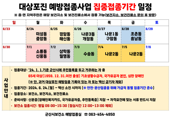 군산시보건소가 오는 24일부터 65세 이상 취약계층을 대상으로 대상포진 무료 예방접종을 실시한다.