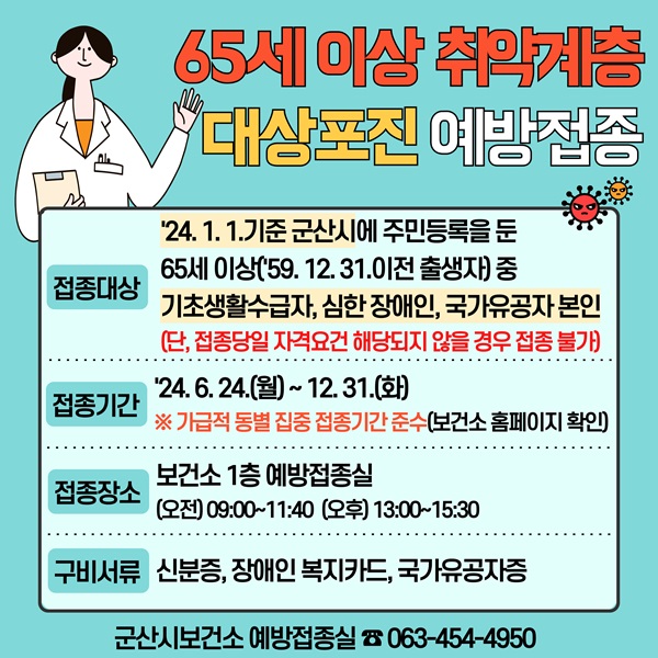 이에 따라, 군산시는 취약계층의 경제적 부담 경감 및 질병 예방을 위해 2024년 1월 1일 기준 군산시에 주민등록을 둔 65세(1959년 12월 31일 이전 출생자) 이상 중 기초생활수급자, 장애의 정도가 심한 장애인, 국가유공자 본인을 대상으로 1회 무료 접종을 추진한다.