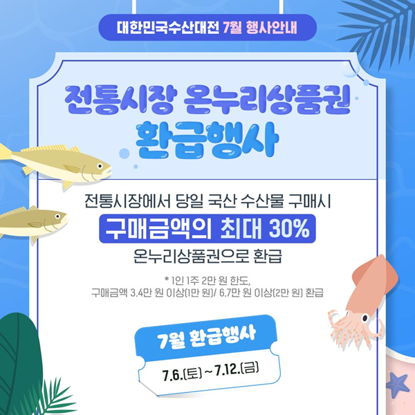 수산물 온누리상품권 환급행사 참여방법은 행사 참여 점포라는 안내판이 게시된 점포에서 국내산 수산물, 젓갈류 등 가공식품을 구입하면 된다. ▲3만4000천원 이상 구매할 경우 1만원 ▲6만7000원 이상 구매시 2만원으로 1인당 2만원 한도 내에서 온누리상품권으로 환급받을 수 있다.