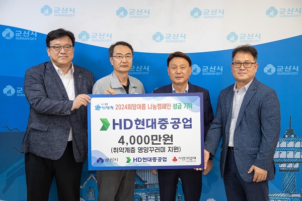 HD현대중공업(대표이사 이상균․노진율)이 11일 무더위에 지친 사회복지시설이용자를 위해 4,000만원 상당의 여름나기 영양꾸러미를 군산시에 전달해 지역사회에 귀감이 됐다.