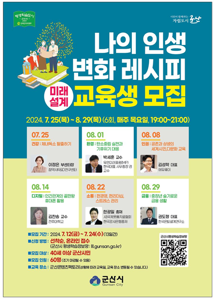 교육 대상은 40세 이상 군산시민이면 누구나 참여 가능하며 수강을 원하는 시민은 오는 24일까지 군산시평생학습정보망(lll.gunsan.go.kr)에 접속해 신청하면 된다.
