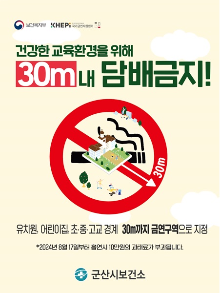 오는 17일부터 시행되는 ‘국민건강증진법’ 개정에 따라 군산시는 유치원, 어린이집을 비롯해 초⁃중⁃고 시설의 경계선으로부터 30m 이내의 구역이 금연구역으로 확대된다.