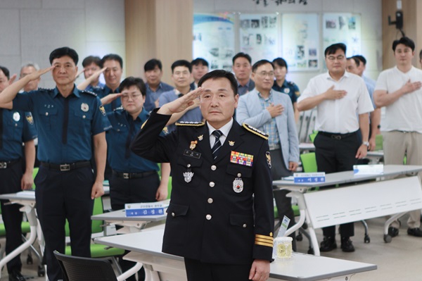 이날 김현익 서장은 경찰서 진포마루에서 80여 명의 직원이 참석한 가운데 취임식을 가졌다.