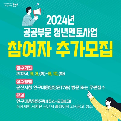 군산시는 ‘2024 공공부문 청년 멘토 사업’ 참여자 2명을 오는 3일부터 10일까지 추가 모집한다.