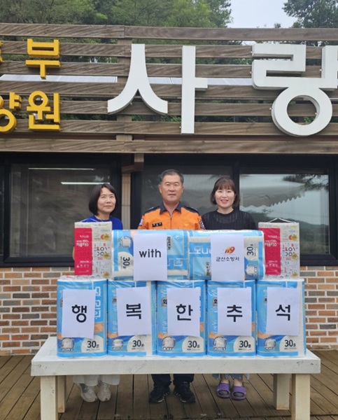 군산소방서(서장 구창덕)는 6일 나포면에 위치한‘사랑마을요양원’과 미원동‘희망의 쉼터’를 찾아 추석 명절 맞이 위문품을 전달했다.