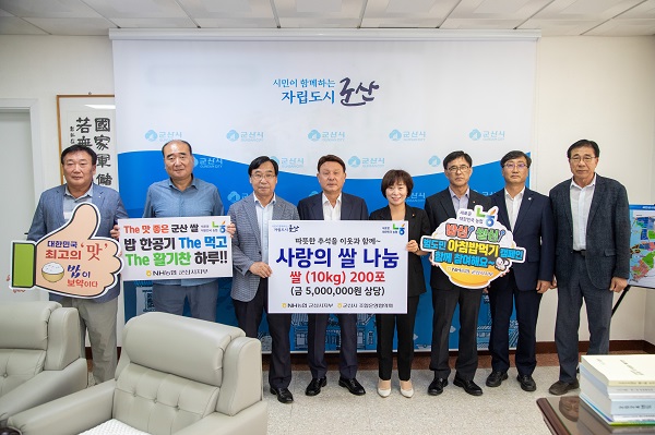 NH농협 군산시지부(지부장 원천연)와 군산시 조합운영협의회(의장 박영근)가 12일 추석을 맞아 군산시에 사랑의 백미 10kg 200포(500만원 상당)를 기부했다.
