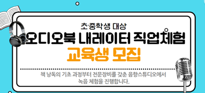 군산콘텐츠팩토리가 관내 초·중학생을 대상으로 ‘오디오북 내레이터(소리책 해설가) 직업체험 2차’ 교육을 오는 26일과 11월 9일 운영한다.
