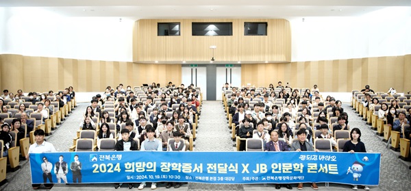 JB금융그룹 전북은행(은행장 백종일)의 후원으로 운영되는 (재)전북은행장학문화재단(이사장 김영구)은 지난 19일 전북은행 본점 3층 대강당에서 도내 중·고등학교 장학생 및 학부모 400여명을 초청해 장학증서 전달식 및 대학생 대상 아이패드 지원 사업 전달식을 실시했다.