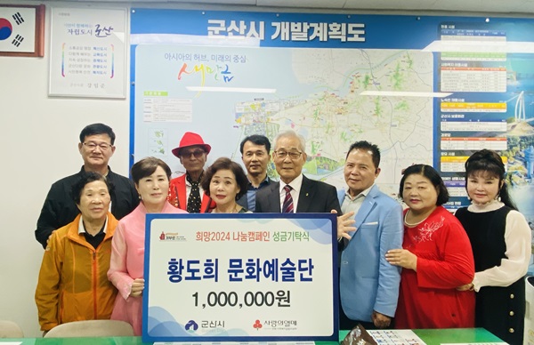 황도희 문화예술단(단장 황도희)은 21일 군산시 어려운 이웃을 위해 사용해 달라며 성금 100만원을 군산시에 기탁했다.