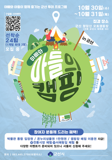 프로그램 참여를 원하는 아빠와 아들은 군산시 공식 사회관계망 계정(블로그, 페이스북, 인스타그램) ‘아들과 캠핑 in 군산’ 게시글의 QR부호를 통해 신청할 수 있으며 참가비는 1인당 20,000원이다