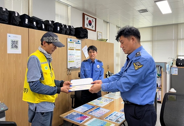 해경이 비응항 어선 폭발 사고에 적극적 진화 작업과 인명구조를 실시한 시민 2명에게 감사장을 전달했다.