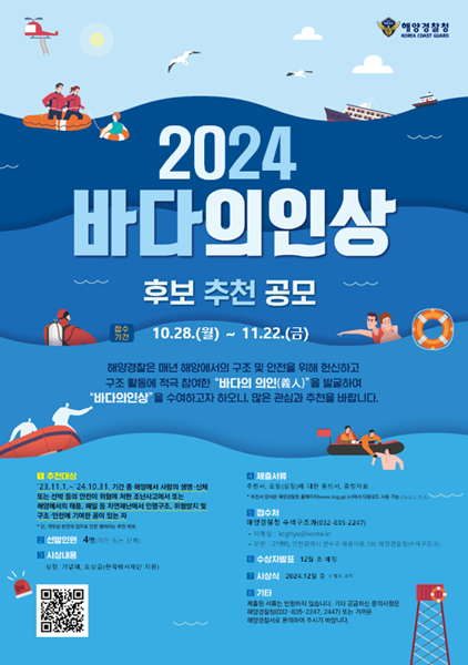 군산해양경찰서(서장 박상욱)은 28일부터 오는 11월 22일까지 ‘2024년 바다 의인상’후보자를 공모한다.