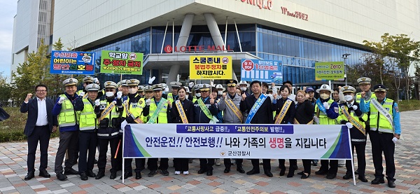 군산경찰서(서장 김현익)는 음주운전 근절과 무단횡단 금지 등 교통문화확산을 위해 조촌사거리(롯데몰사거리)에서 협력단체, 관계기관과 합동으로 교통안전 캠페인을 실시했다.