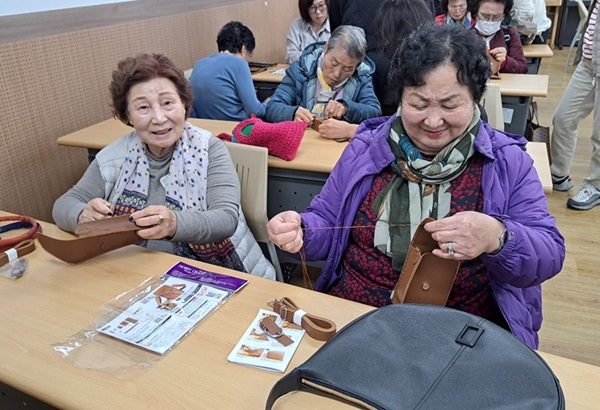 가죽에 난 구멍에 바늘을 통과시키는데 집중하며 한데 모인 동료 어르신들과 소통하며 한땀 한땀 가방을 완성시키는 모습을 볼 수 있었다.