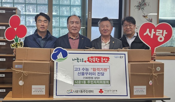 이날 전달된 선물꾸러미는 나운1동 주민자치위원회(위원장 김승수)에서 수험생 합격 기원과 취업 성공을 응원하기 위해 기탁된 성금으로 마련됐다.