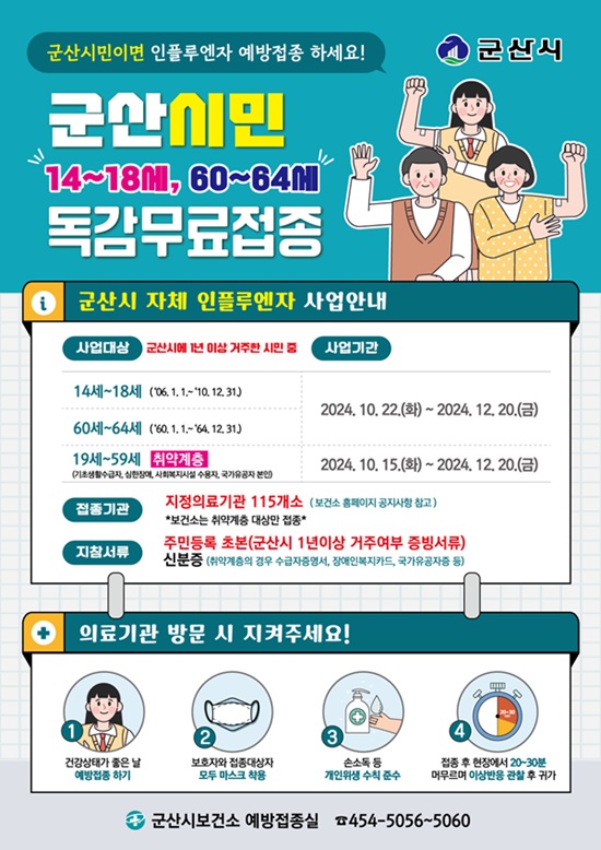 시는 올해 국가 예방접종 대상자에서 제외된 시민들에게도 자체 예산을 확보해 독감 예방접종을 확대 지원하고 있다. 대상자는 19~59세 취약층(기초생활수급자‧심한장애‧사회복지시설 수용자‧국가유공자 본인)과 14~18세 및 60~64세 군산시민이다. 단, 시에 주소를 두고 1년 이상 거주하고 있어야 한다는 조건이 붙는다.