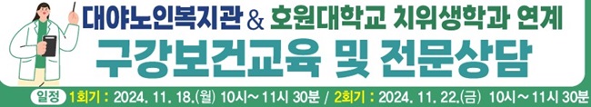 대야노인복지관과 호원대 치위생학과는 18일과 22일 오전 10~11시 반까지 2회기에 걸쳐 대야노인복지관 3층 다목적 강당에서 구강보건교육과 전문 상담 프로그램을 진행할 예정이다.