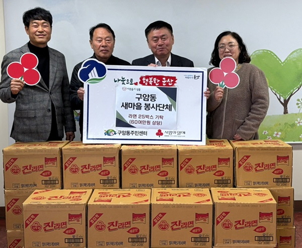 구암동 새마을 봉사단체(회장 전만용)는 20일 저소득층을 위해 60만원 상당의 라면 25박스를 기부했다.