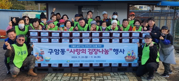 구암동은 지난 25~26일 이틀간 구암동 부녀회(회장 김봉임) 주관으로 자생 단체가 함께 관내 취약층을 위한 ‘사랑의 김장 나눔’ 행사를 진행했다.