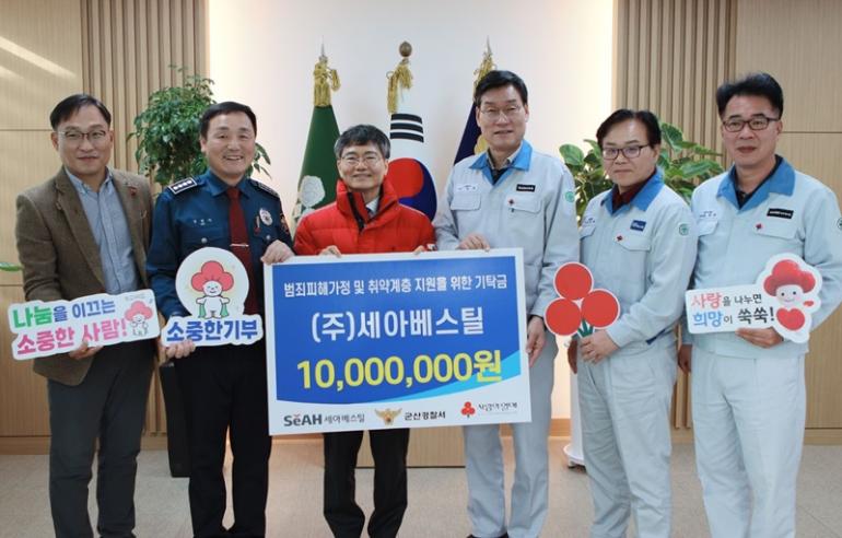 ㈜세아베스틸(대표이사 서한석)은 군산경찰서, 전북사회복지공동모금회와 범죄피해자 및 취약층을 돕기 위한 지원금 기탁식을 가졌다.
