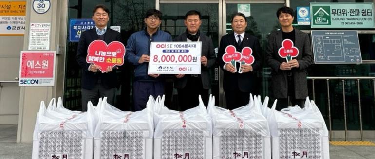 OCI SE(주)(대표이사 한철)는 발전소 주변 지역인 소룡동 · 미성동 · 옥서면의 저소득 가정 8세대에 각각 100만원씩 총 800만원의 성금을 기탁했다.
