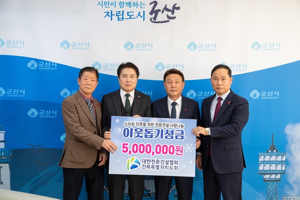 대한전문건설협회 전북특별자치도회(회장 임근홍)는 10일 ‘희망2025 나눔캠페인’에 동참하며 어려운 이웃을 위해 써달라고 군산시에 성금 500만 원을 기탁했다.
