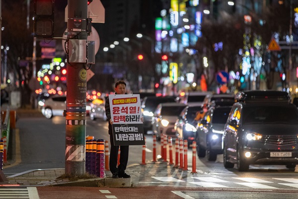 그는 '불법 계엄·내란 사태 윤석열 탄핵하라! 탄핵 반대는 내란 공범!' 이라는 문구가 적힌 피켓을 들었다.