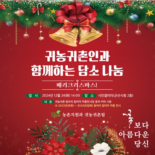 먼저 24일부터 군산시청 2층 시민갤러리에서는 주민과 귀농귀촌인이 만든 유화와 압화 작품이 전시되며 오후 2시에는 꽃차와 커피를 시음할 수 있는 귀농·귀촌인과 함께하는 담소나눔 행사가 열린다.