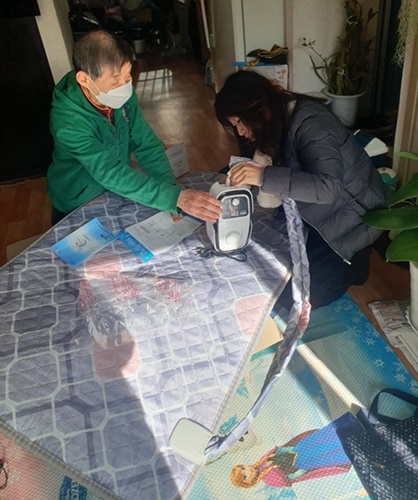 군산노인종합복지관은 노인맞춤돌봄서비스 특화사업 대상자 중 겨울철 난방이 힘든 어르신 우선 4명에게 전담사회복지사가 각 가구를 방문해 직접 전달하고 사용법에 대해 설명하며 사용에 어려움이 없도록 했다.