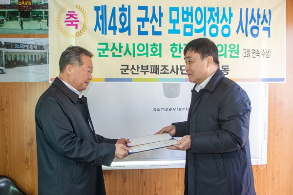 올해 군산부패조사단이 주는 모범의정상에 한경봉 시의원이 수여했다.
