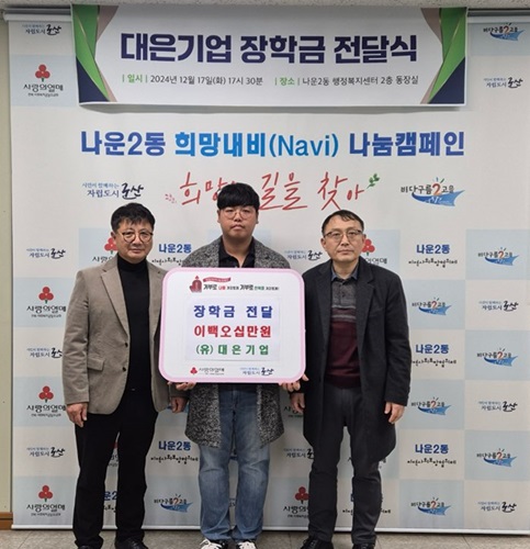 이화섭 나운2동장은 “지난해 이어 올해도 장학금을 기탁한 (유)대은기업 대표이사께 진심으로 감사드린다”며 “전달받은 장학금은 기부자의 취지대로 저소득 학생들에게 큰 디딤돌이 될 것이다”고 밝혔다.