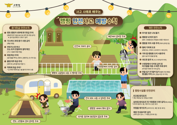 또 텐트와 텐트 사이 간격을 1m 이상 확보해 불길 확산을 방지하고 간이소화기를 비치해 초기 화재에 대응할 수 있도록 준비해야 한다고 덧붙였다.