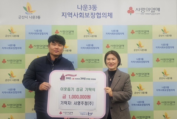 서영주정(주)(공동대표 김경미, 이원열, 김지희)이 지난 26일 어려운 이웃에게 도움이 되고 싶다며 100만원을 기탁했다.