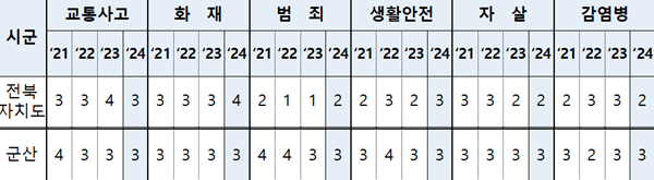 ◇전북자치도와 군산시 지역안전지수 최근 4년간 현황(전북도 제공).