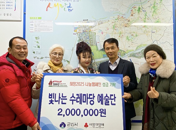 빛나는 수레마당 예술단(단장 유빛나)이 7일 ‘희망2025나눔캠페인’에 동참하며 군산시에 어려운 이웃을 위한 성금 200만원을 전달했다.