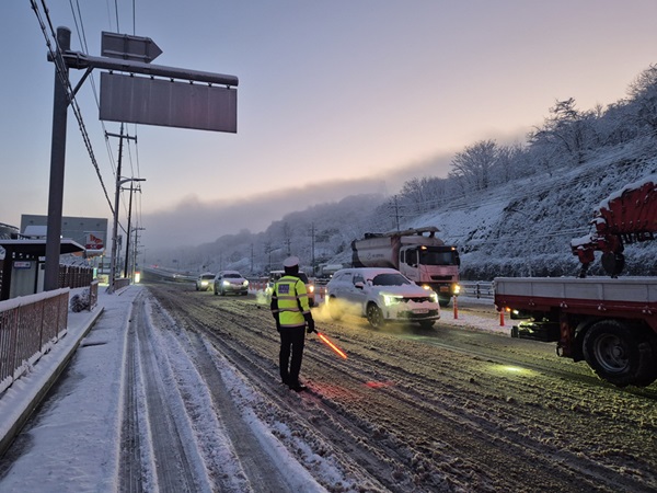군산서는 교통안전대책반을 운영하며 실시간 기상상황을 면밀히 분석하고 관내 순찰과 도로통제, 차량 우회도로 확보 등 신속한 초동조치로 시민 안전과 불편을 최소화하는 데 초점을 맞춰 진행했다.
