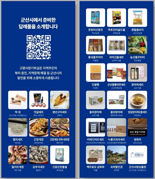 군산시가 ‘2025 군산시 고향사랑기부제 답례품 및 공급업체’ 공개 모집을 실시한다.