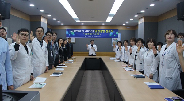 군산의료원(원장 조준필)은 2025년 새해를 맞아 지난 13일 임직원이 참석한 가운데‘미션·비전 및 인권경영 선포식’을 개최했다.