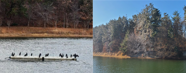 ◇은파호수공원서 서식하는 민물가마우지(左)와 강한 상선 성분을 가진 배설물로 인해 백화현상을 보이는 나무.