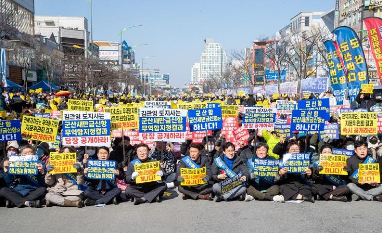 김관영 도지사의 자문위 결과 은폐로 지역사회 반발이 거세지면서 ‘새만금 신항만 무역항 지정 자문위원회’ 회의 결과 투명한 공개 촉구와 새만금신항만 사수 대규모 궐기대회가 22일 롯데마트 앞 도로에서 5천여명이 모인 가운데 각각의 피켓을 들고 뜨거운 열기속에서 진행됐다.