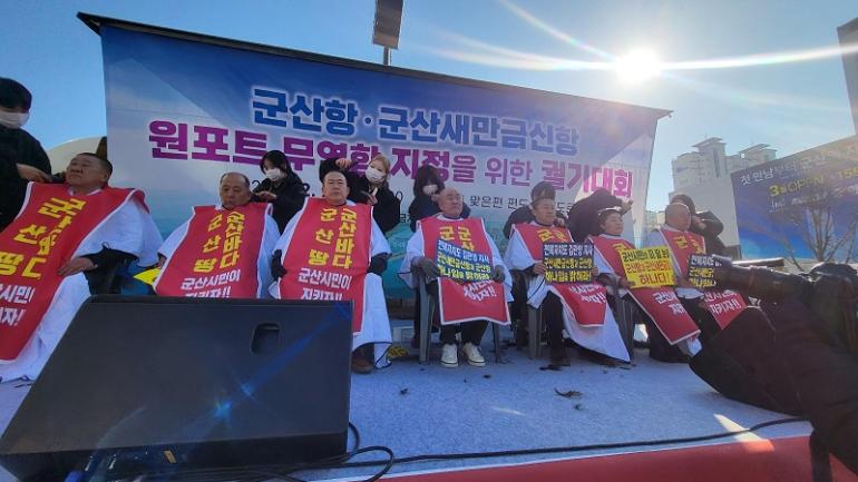 군산새만금지킴이 범시민위원회(위원장 이래범)가 주최한 이번 집회에는 전북서부항운노조, 어촌계협의회, 주민자치위 등 각계 시민단체를 비롯, 강임준 시장, 신영대 국회의원, 김우민 시의회의장, 김영일 시의회 새만금특별위원장을 비롯 주최측 추산 약 5,000여명이 참석한 가운데 새만금무역항 지정 자문위 결과 투명한 공개와 새만금신항만 사수를 위한 시민결속을 다졌다.